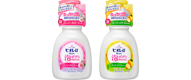 「ビオレu 泡で出てくる!ボディウォッシュ」は、花王独自開発技術SPTをベースに、伸びのよいもっちり泡なので、手のひら洗いでも全身すみずみまで洗いやすいという。今回、香りを楽しみたいというニーズに応え、「エンジェルローズの香り」と「フレッシュシトラスの香り」を新発売する。