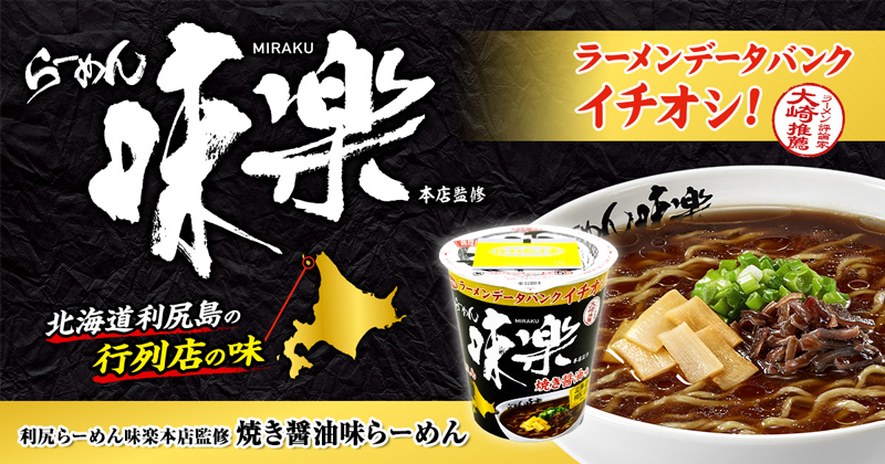 シリーズ第1弾「利尻らーめん味楽本店監修 焼き醤油味らーめん」は、北海道で昆布の産地としても有名な利尻島にあり、営業時間が日中の数時間に限られることから、「なかなか食べに行けない店」としてラーメンマニアにも有名な「らーめん味楽」監修による看板メニュー「焼き醤油らーめん」のカップ麺。もっちりとした食感のちぢれ麺と昆布のうまみにロースト感のある醤油を使用した奥深いスープが楽しめるという。