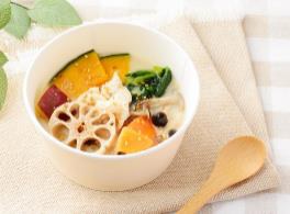 「きのことチーズのオートミールリゾット」(税込499円)、「オーツ麦うどん粕汁風」(499円)、「ソルロンタン(塩麹入り)」(530円)、「大麦パンきのこ大豆キーマカレー」(170円)、「酒粕仕立ての豆乳味噌スープ」(399円)、「糀甘酒蒸しパン~カラフルおまめ~」(160円)、「もち麦入りきのこと豆乳のチゲスープ」(530円)を用意した。