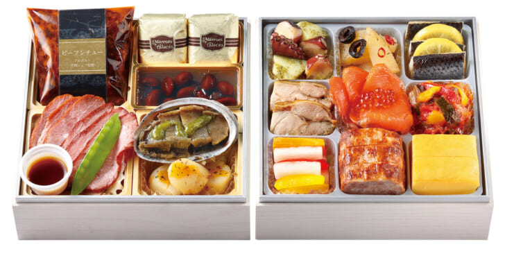 「アルポルト片岡シェフ監修 和イタリアン おせち二段重」(2万円、2~3人前)は、イタリアンの名店「アルポルト」のオーナーシェフ片岡 護氏監修のおせち。和食とイタリアンを融合させた具材、メニューをそろえ、幅広い年代の人が食べられるように仕立てた。
