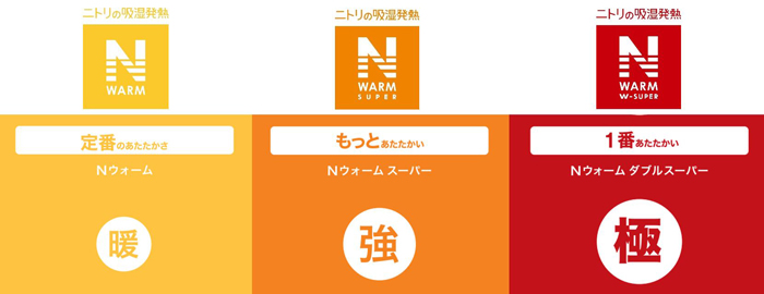 Nウォームとは体から発散される水分を熱に変える「吸湿発熱素材」を使用したアイテム。肌に触れた部分からじんわり、あたたかくなるのが特長。あたたかさは3種類で、定番のあたたかさの「Nウォーム」、もっとあたたかい「Nウォームスーパー」、1番あたたかい「NウォームW(ダブル)スーパー」を用意した。乾燥しがちな冬に嬉しい「保湿機能」を3種類すべてに搭載しており、なめらかな肌触りで快適に使用できる。