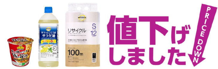 対象商品は、「サラッとコクうまサラダ油」(税別298円から278円)、「ヌードル3種」(128円から108円)、「リサイクルトイレットペーパー」(528円から518円)など、生活必需品の中で特に要望の多かった商品を厳選したとしている。