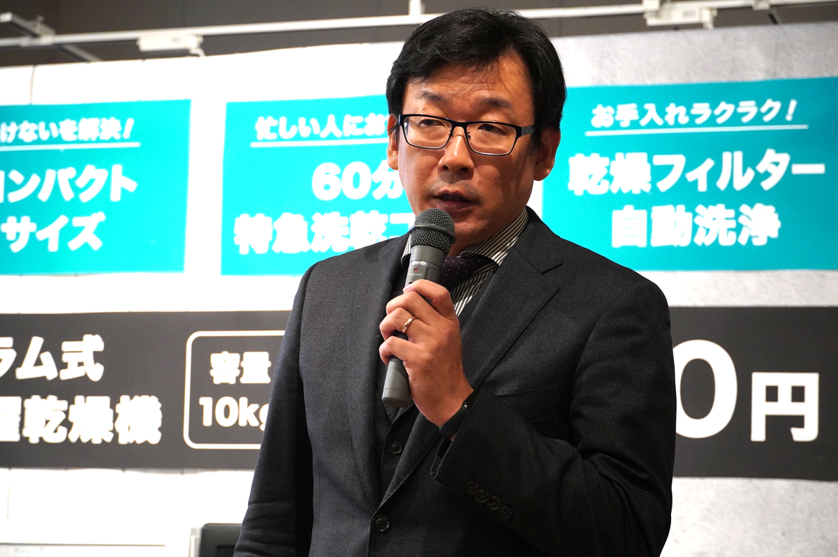 多忙な主婦層に買って良かった家電を聞くと、1位に挙がるのがドラム式洗濯乾燥機だ。人気が高い一方、洗濯機市場での売上構成比を見ると25%と現状、頭打ちになっている。欲しい人に買わない理由を聞くと、半数が価格だと答えた。縦置き式の平均売価が7万円に対し、ドラム式は20万円以上とべらぼうに高い。この常識に挑戦し、本格的な性能を持ちながら衝撃価格で提供する」と述べた。