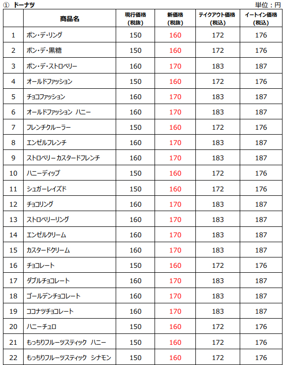 原材料価格や原油価格、物流費などの諸経費の高騰によるコスト増加が続いており、現在販売中のドーナツ商品42種類を10円値上げする(改定率5.6%)。