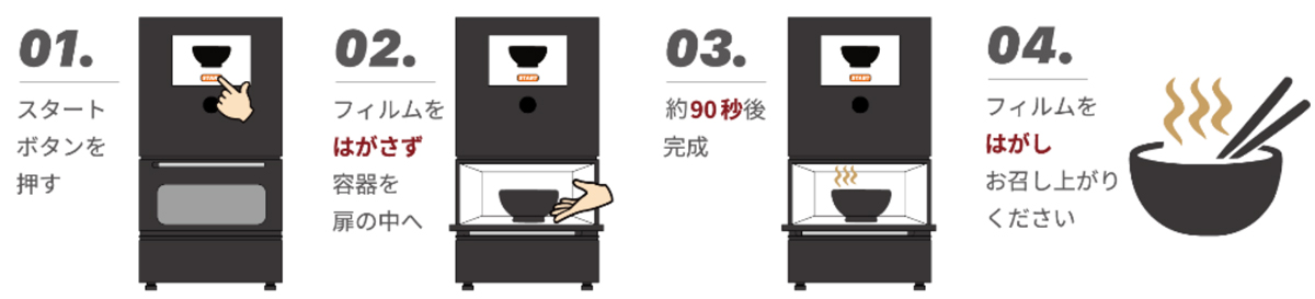 商品は冷凍食品として販売。顧客は店内の冷凍ケースで販売している商品を購入し、専用のマシンで商品のQRコードを読み込んでから、中に入れてスタートボタンを押すと約2分で調理が完了する。マシンの操作は「セブンカフェ」などと同様にセルフオペレーションとなる。