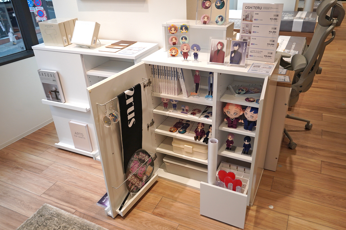 新店の2階には、シリーズ累計販売数5000個を突破した人気商品・推し活収納棚「OSHITERU(オシテル)」も並ぶ。社員がInstagramで、LOWYAの家具を推し活に活用している声や写真を見つけたことから企画をスタートしたもの。プロジェクトチームには推し活中の社員10人が参加。入念な市場調査と細かなペルソナ設定を行い、オタクの知恵を結集して完成させた。