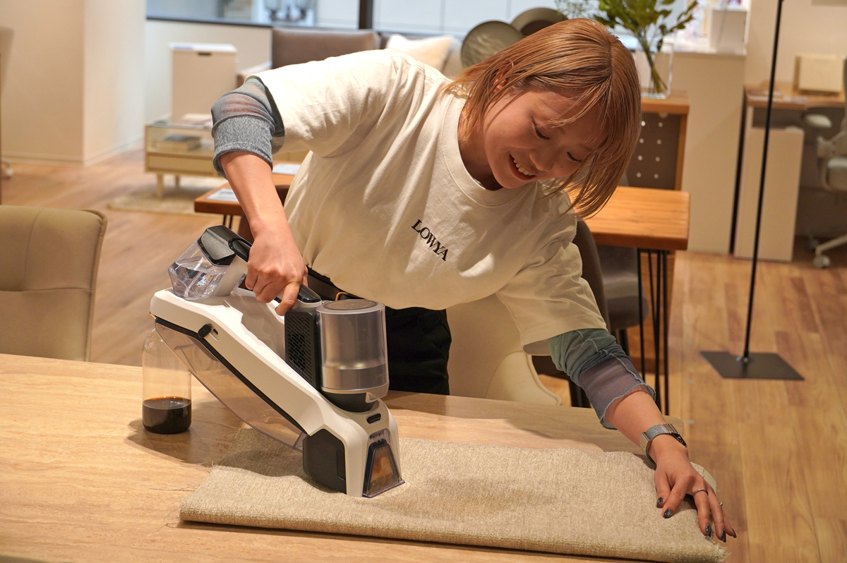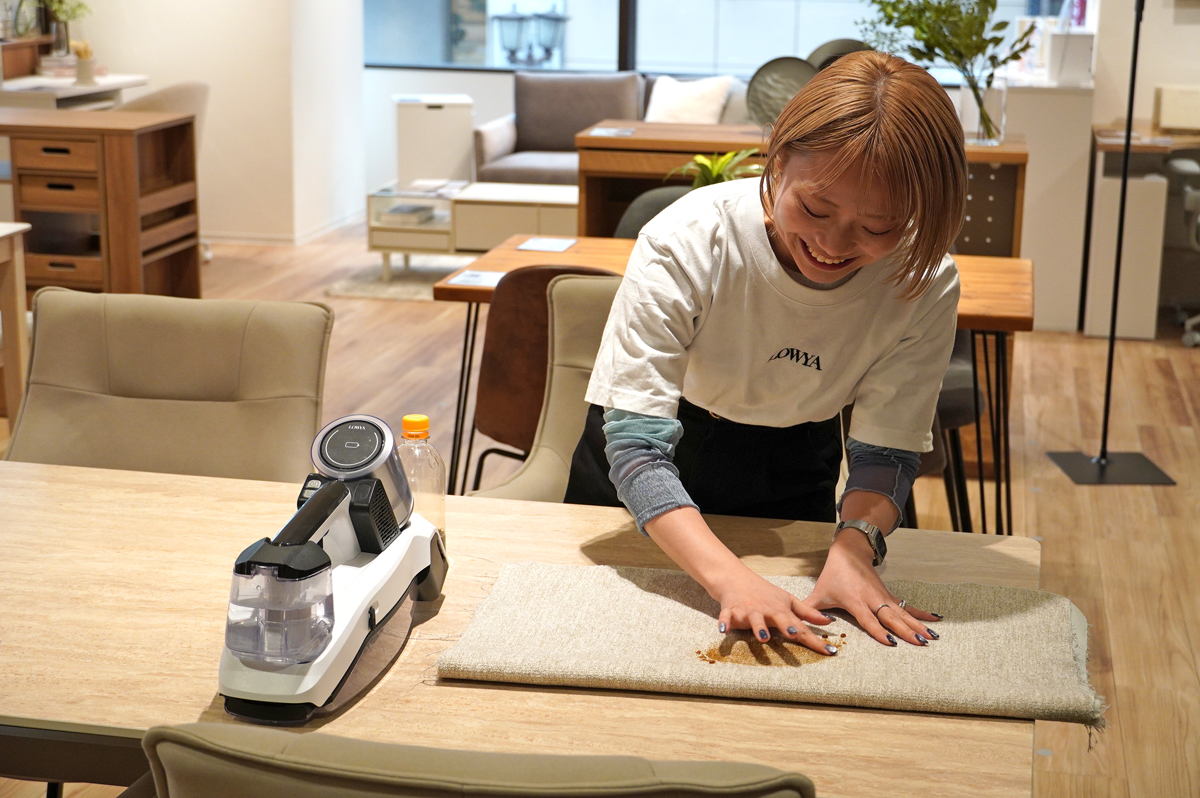 コードレスで使えるカーペットクリーナー(9990円)は、カーペットにうっかり落としたコーヒーやソースの汚れを吸引するもの。車のシートの掃除などにも使える。