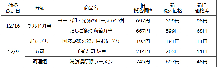 また、12月9日から、「阿波尾鶏の鶏五目おにぎり」(九州・沖縄地区、「ローソンストア100」を除く)、「手巻寿司 納豆」(「ローソンストア100」を除く)、「満腹濃厚豚ラーメン」(沖縄地区、「ナチュラルローソン」、「ローソンストア100」を除く)の定番3品も値下げして販売している。