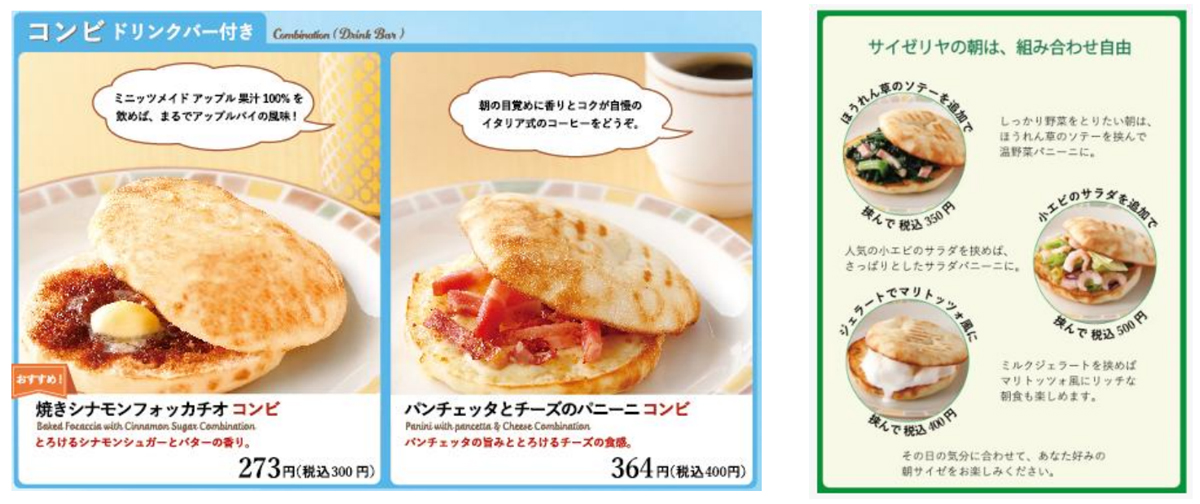 「朝サイゼ」は、焼きシナモンフォッカチオコンビ(税込300円)やパンチェッタとチーズのパニーニコンビ(400円)など、手頃な価格で楽しめる朝食限定メニュー。イタリア式コーヒーとともに提供される。