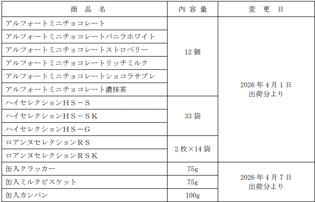 4月1日出荷分は「アルフォートミニチョコレート」(6商品)「ハイセレクション」(3商品)「ロアンヌセレクション」(2商品)の全11商品を値上げ。