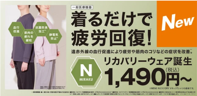 「Nミラクシリーズ」は、一般医療機器「家庭用遠赤外線結構促進用衣」届け出済み衣料。原材料繊維に高純度セラミックスを定着する加工を施すことによって、遠赤外線の血行促進作用による疲労回復や筋肉のコリを軽減する効果が期待できるという。