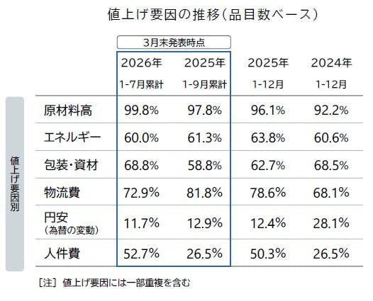 なお、2026年の値上げは、1~7月までの累計で5729品目となり、年間の平均値上げ率は15%。年間の値上げ品目予定が1万品目を超えていた前年同時期(2025年3月31日時点、1万1707品目)に比べ、2026年3月31日時点では予定を含めて前年比5割減ペース。