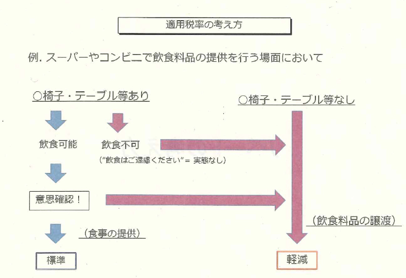 スーパーマーケットなどでは、「飲食する場合はお申し出ください」といった貼り紙を掲示し、お客の申し出に基づき適用税率を判断するといった方法も認められることとなる。
