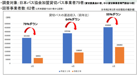 日本バス協会は、新型コロナウイルスによるバス事業への影響及び支援要望を提出。貸切バスの運送収入が、3月に79%減、4月に64%減、5月に55%減となる推計を発表した。