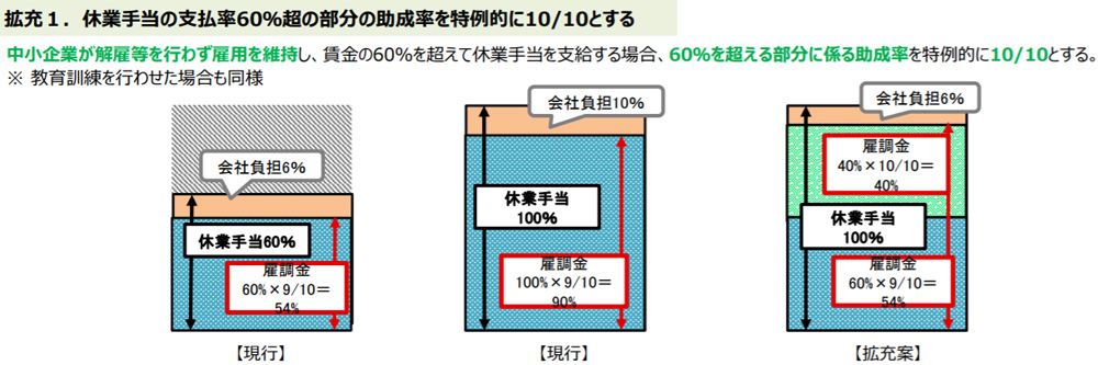中小企業が解雇等を行わず雇用を維持し、賃金の60%を超えて休業手当を支給する場合、60%を超える部分に係る助成率を特例的に10/10(100%)とする。