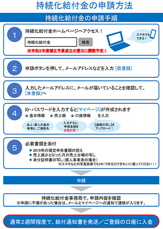 持続化給付金を必要とする人が幅広く活用できるよう、申請期間と予算額については十分な余裕を確保する予定だ。申請後、2週間程度で給付することを想定している。