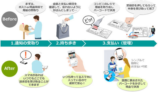 従来、コンビニの店頭レジで支払う際、請求事業者から郵送される払込票やコンビニ店内のキオスク端末で発行した払込票の提示が必要だった。