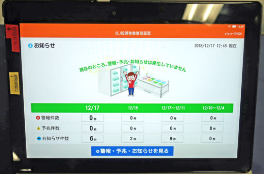 店舗従業員が利用するタブレット端末には、軽微な不備を知らせる「お知らせ」、機器の故障の予兆を知らせる「予兆」、機器の故障や異常を知らせる「警報」の3つを表示する。
