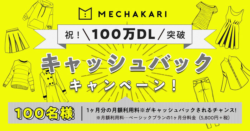 今回の100万ダウンロード突破を記念し、メチャカリ有料会員の中から抽選で100人に、ベーシックプラン月額相当の6264円のキャッシュバックキャンペーンを実施する。
