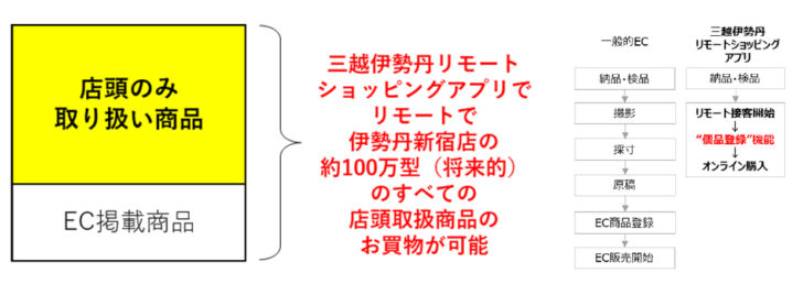 将来的に、EC未掲載商品を含め、伊勢丹新宿店で取り扱いのある約100万型全ての商品がリモートで購入できることを目指す。
