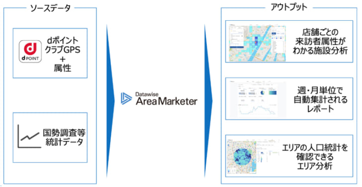 「Datawise Area Marketer」は、NTTドコモの協力のもと開発された、ドコモGPS統計データ・アンケート統計データ、属性情報を活用した人流分析ツール。自店舗・競合店舗の商圏、商圏比較、出店候補地における昼間人口・夜間人口の年収・世帯構成、出店候補地における交通量などを把握できる。