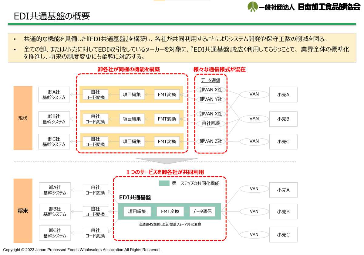 今回、流通革新、特にDX化に迅速かつ合理的に対処するためには、流通BMSを基本とした卸共通フォーマットの推進と、各社のシステムに共通する機能を共同で利用できるEDI共通基盤の構築が重要であるという共通認識を確認。今後はJIIを事業会社として、EDI.PFの取り組みを進めていく。