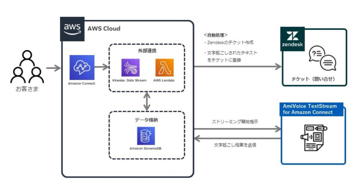 「音声文字化サービス for Amazon Connect」は、アドバンスト・メディアが提供するAmazon Connectの通話音声をテキスト化する音声認識API「AmiVoice TextStream for Amazon Connect」とエクレクトが販売代理を担うカスタマーサポートソフトウエア「Zendesk」を連携し、テキスト情報を終話後に「Zendesk」へ反映できる仕組み。