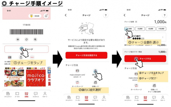 また、「majica」内のマネー残高が不足したら、あらかじめ設定した金額分を自動的に銀行口座からチャージできる「オートチャージ」機能も導入する。