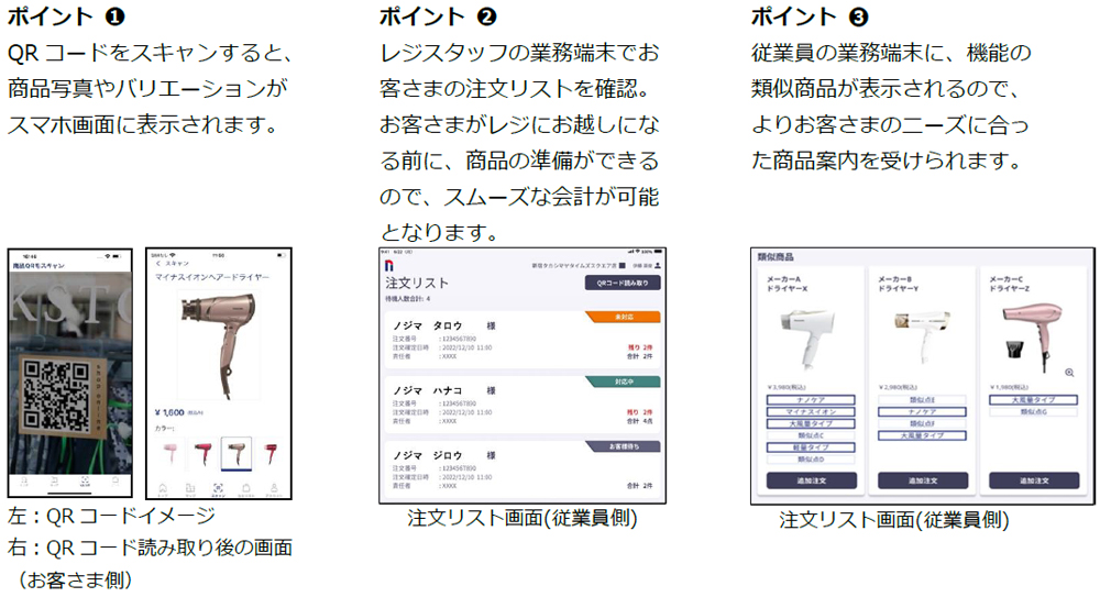 今回、新たな顧客体験価値の具現化の第1弾として、来店から商品購入までのさまざまな場面で、お客をサポートする2種類のデジタルサービス「QRコードを利用した注文」「店員呼び出しボタンを付けた店内マップ」をノジマの全ての店舗(221店舗)で開始した。