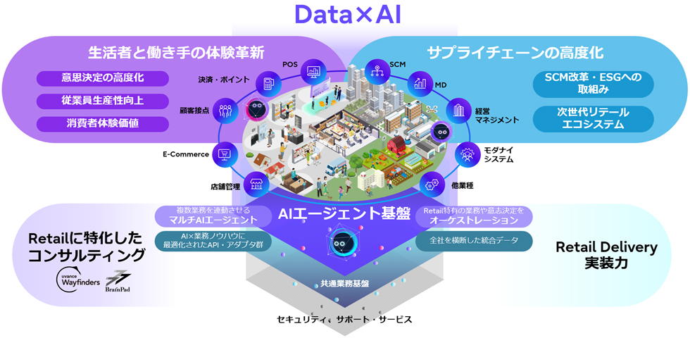 セキュアなクラウド環境でデータを統合し、AIエージェントなどの先進技術を活用することで、現場の実行力や経営の意思決定を高度化し、小売業の競争力強化を目指している。