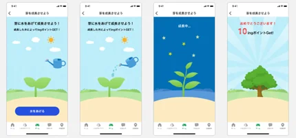アプリ内で「ミールマイル」が付与されるタイミングは、値引き商品を購入した翌日。ホーム画面で確認できる。30ミールマイルを貯めると、ゲームを1回プレイ可能。水をあげて芽を成長させると、木の成長度合いに応じて「ingポイント」が獲得できる。