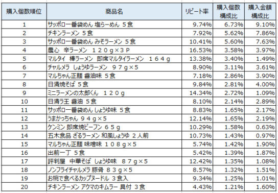 True Dataが提供するID-POSデータ分析サービス「TRUE DATA」によると、2018年6月~8月の「インスタント袋麺」の購入個数ランキングは、以下の通りとなった。