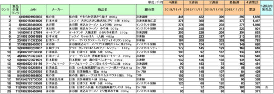 5週間以内に発売した商品は、19位日清「日清どん兵衛 ねぎ油風味豚だしそば」98g希望小売価格本体193円となった。