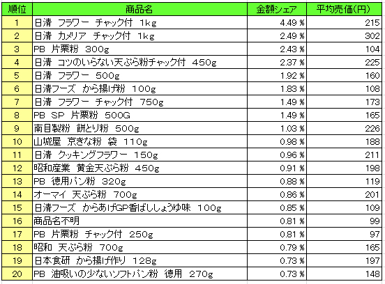 流通経済研究所が提供するPOSデータ分析サービス「NPI Report」によると、12月21日~12月28日の「粉類」のPOSデータによる売上ランキング(売上高上位20)は、以下の通りとなった。
