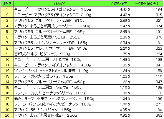 流通経済研究所が提供するPOSデータ分析サービス「NPI Report」によると、2016年1月4日~1月10日 「スプレッド類」のPOSデータによる売上ランキング(売上高上位20)は、以下の通りとなった。