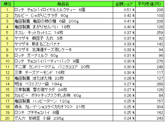流通経済研究所が提供するPOSデータ分析サービス「NPI Report」によると、2016年2月22日~2月28日の「菓子」のPOSデータによる売上ランキング(売上高上位20)は、以下の通りとなった。