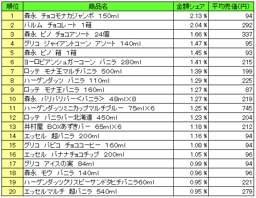 流通経済研究所が提供するPOSデータ分析サービス「NPI Report」によると、2016年3月14日~3月20日の「アイスクリーム類」のPOSデータによる売上ランキング(売上高上位20)は、以下の通りとなった。