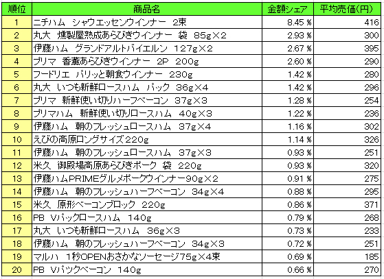 流通経済研究所が提供するPOSデータ分析サービス「NPI Report」によると、2016年3月14日~3月20日の「加工肉類」のPOSデータによる売上ランキング(売上高上位20)は、以下の通りとなった。
