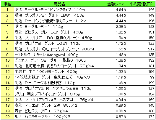 流通経済研究所が提供するPOSデータ分析サービス「NPI Report」によると、2016年3月21日~3月27日の「デザート・ヨーグルト」のPOSデータによる売上ランキング(売上高上位20)は、以下の通りとなった。