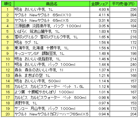 流通経済研究所が提供するPOSデータ分析サービス「NPI Report」によると、2016年3月28日~4月3日の「乳飲料」のPOSデータによる売上ランキング(売上高上位20)は、以下の通りとなった。