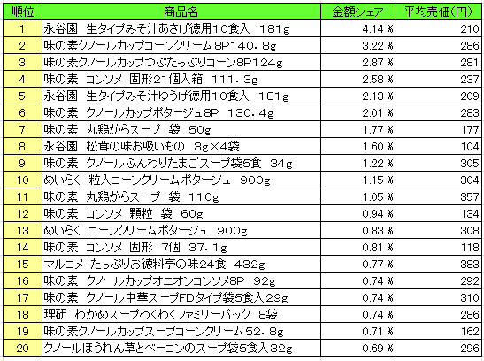 流通経済研究所が提供するPOSデータ分析サービス「NPI Report」によると、2016年4月11日~4月17日の「スープ」のPOSデータによる売上ランキング(売上高上位20)は、以下の通りとなった。