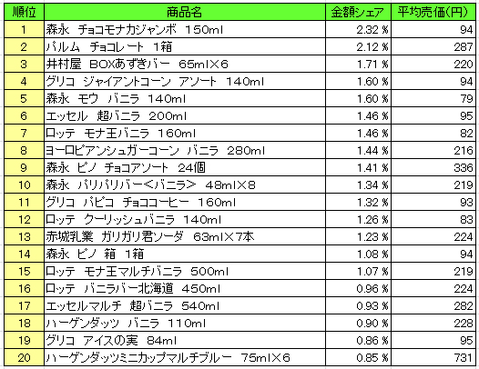 流通経済研究所が提供するPOSデータ分析サービス「NPI Report」によると、2016年5月16日~5月22日の「アイスクリーム類」のPOSデータによる売上ランキング(売上高上位20)は、以下の通りとなった。
