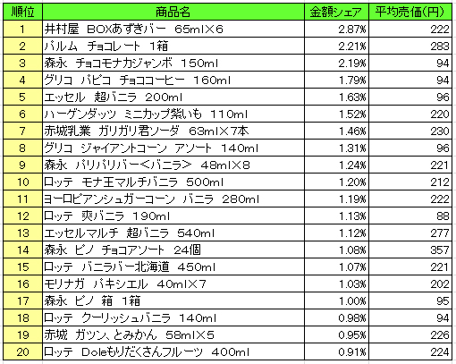 流通経済研究所が提供するPOSデータ分析サービス「NPI Report」によると、2016年8月29日~9月4日の「アイスクリーム類」のPOSデータによる売上ランキング(売上高上位20)は、以下の通りとなった。