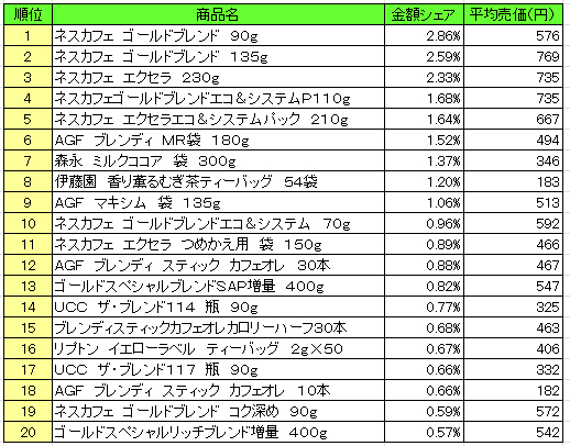 嗜好飲料 売上ランキング/2016年10月10日~10月16日、「ネスカフェ ゴールドブレンド」が1位