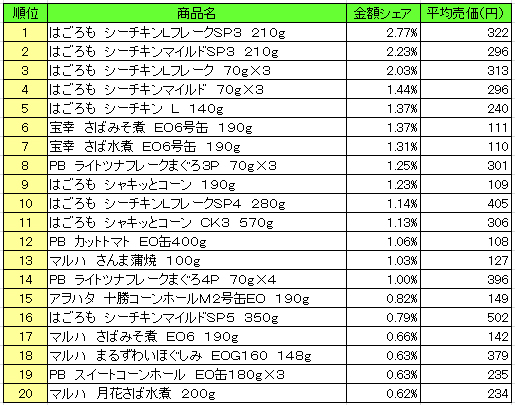 流通経済研究所が提供するPOSデータ分析サービス「NPI Report」によると、2016年10月31日~11月6日の「缶詰」のPOSデータによる売上ランキング(売上高上位20)は、以下の通りとなった。