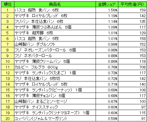 流通経済研究所が提供するPOSデータ分析サービス「NPI Report」によると、2016年12月12日~12月18日の「パン・シリアル類」のPOSデータによる売上ランキング(売上高上位20)は、以下の通りとなった。