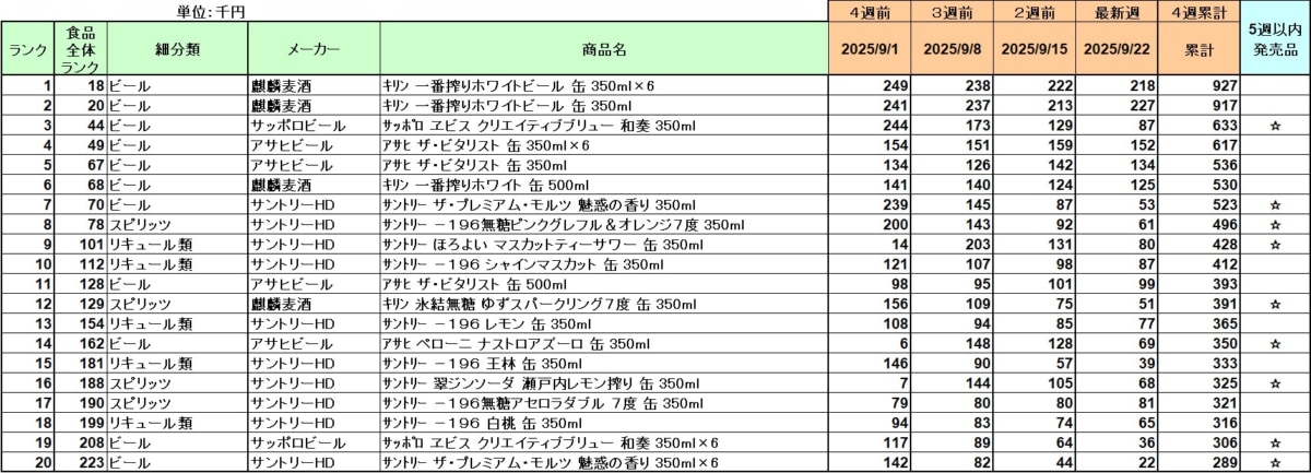 アルコール飲料 売上ランキング/9月1位は「キリン一番搾り ホワイトビール」