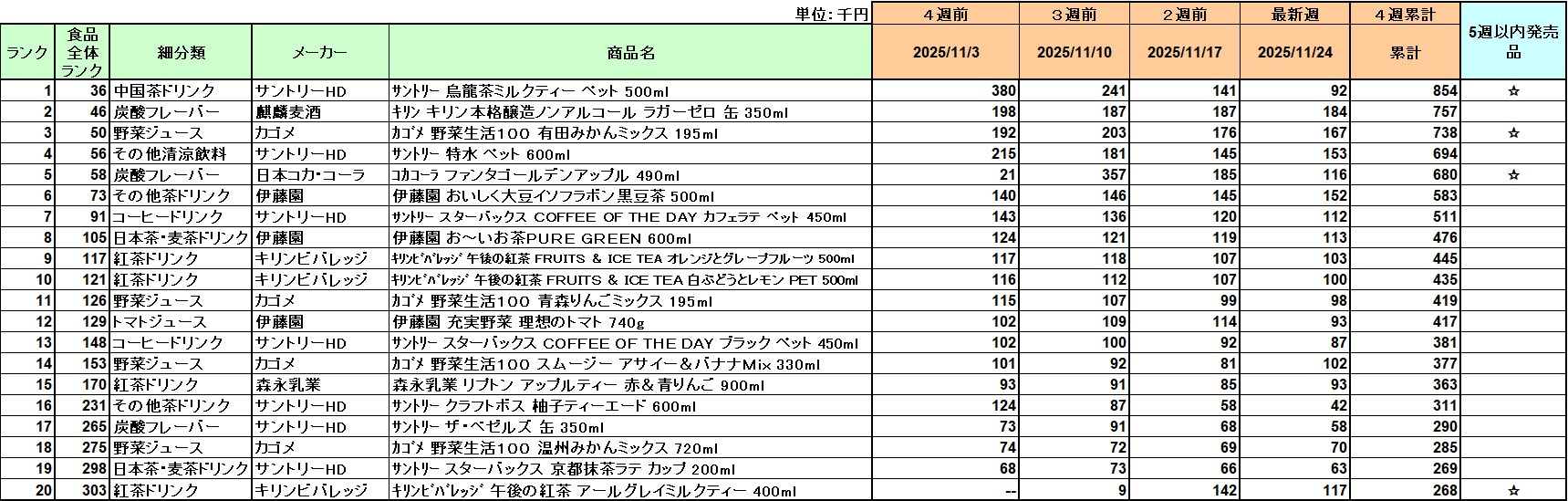 5週間以内に発売した商品は、1位サントリーHD「サントリー烏龍茶 ミルクティー」500ml、3位カゴメ「野菜生活100 有田みかんミックス」195ml、5位日本コカ・コーラ「ファンタ ゴールデンアップル」490ml、20位キリンビバレッジ「午後の紅茶 アールグレイミルクティー」400ml。