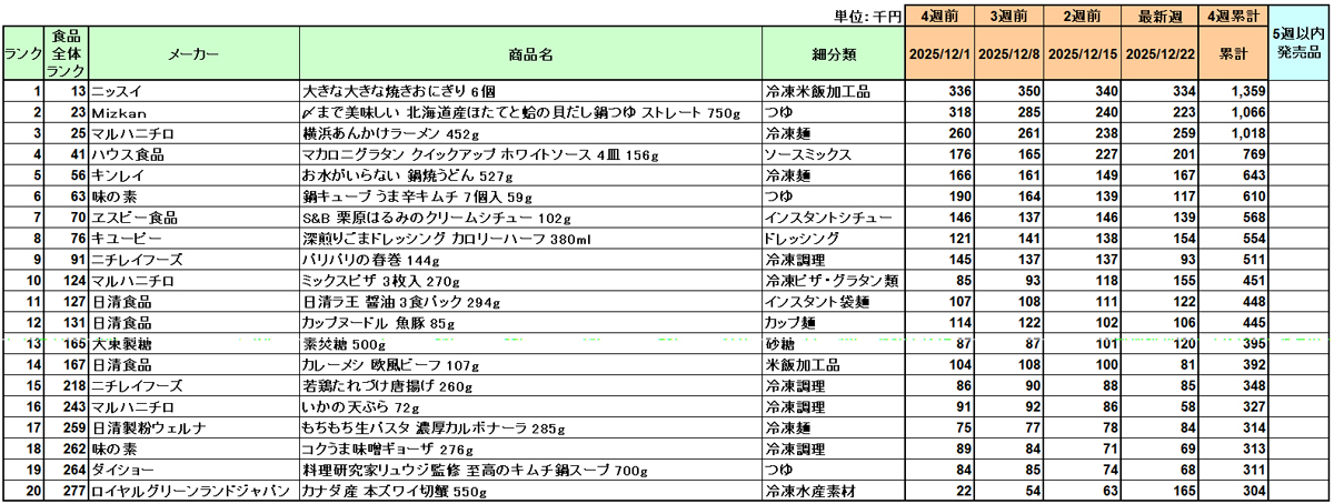 マーチャンダイジング・オンが発表した新商品(加工食品)の売上ランキングによると、12月の1位は、ニッスイの「大きな大きな焼きおにぎり」6個だった。3カ月連続でトップとなった。
