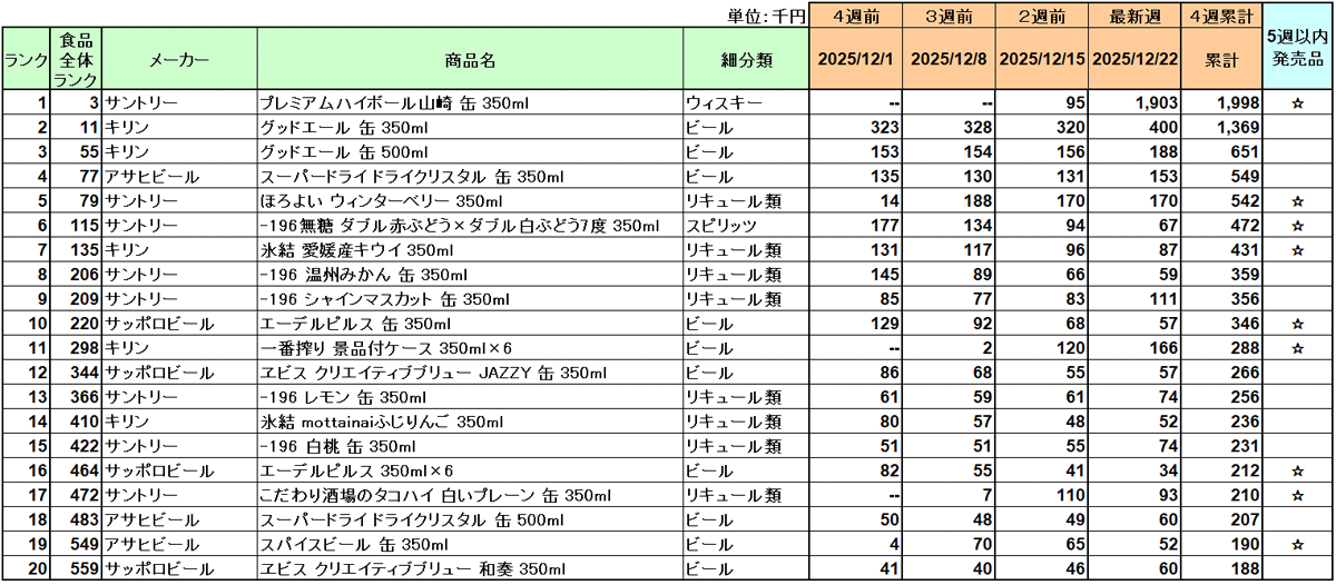 アルコール飲料 売上ランキング/12月はサントリー「プレミアムハイボール山崎」1位